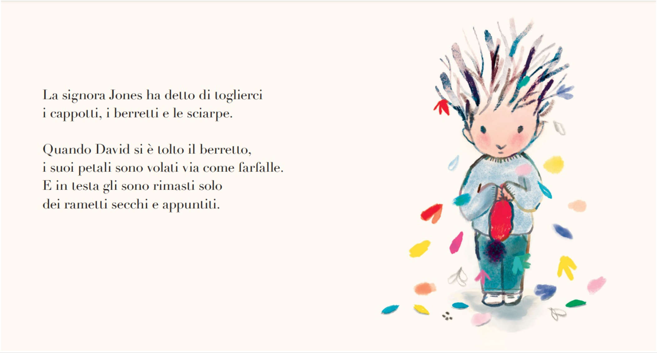 David e il suo migliore amico sono inseparabili e insieme si divertono moltissimo inventando canzoni, saltando nelle pozzanghere e scappando dalle api che ronzano tra i suoi fiori. Ma un giorno succede qualcosa di strano: un petalo si stacca dalla testa di David e rimane tra le dita del suo amico. Da quel momento, David non vuole più giocare, diventa triste e silenzioso. E una mattina, quando David arriva in classe e si toglie il berretto, tutti i suoi petali volano via come farfalle. Dove prima c’erano fiori, ora ci sono solo rametti secchi. Gli altri bambini gli stanno lontani, per paura di pungersi, ma non il suo amico del cuore. Lui vuole restituire a David tutti i suoi colori. Così ha un’idea. Ritaglia tanti fiori colorati da attaccare sulla testa di David. La paura sembra svanita: adesso anche tutti gli altri bambini vogliono preparare un fiore. Ora David è tornato come prima. Beh, non proprio… quasi. Ma può ricominciare a sorridere e giocare. Un giorno, spunta un fiore nuovo tra i capelli di David. Non uno di carta. Un fiore vero, bellissimo. E poi un altro e un altro ancora. Le api tornano a ronzargli tra i capelli. Il suo amico, però, continua a realizzare fiori di carta per lui: «Casomai ne avesse di nuovo bisogno. Ne ho una scatola piena. Per sicurezza. Perché David è il mio migliore amico. E io il suo». Capita a tutti, anche ai bambini, di attraversare un periodo difficile, di sentirsi fragili, di perdere qualcosa o qualcuno di importante, di ammalarsi. Il bambino con i fiori nei capelli è una metafora potentissima di questa fragilità. E di quel piccolo miracolo chiamato amicizia, che ci fa ritrovare la luce anche nel buio più nero.